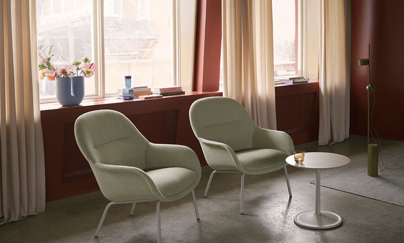 デンマークのブランド Muuto(ムート) によるラウンジチェア。100%再生プラスチック製のシェルに、やわらかなファブリックを組み合わせたサステナブルな一脚です。