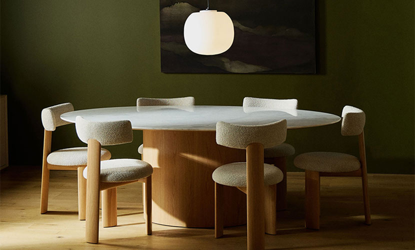 フレームはオーク材で構成され、布とのコントラストが美しく、優しさと温かみを感じさせます。ダイニング空間を柔らかくまとめたい方におすすめです。